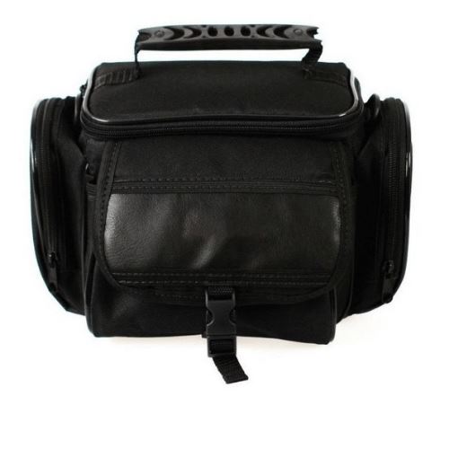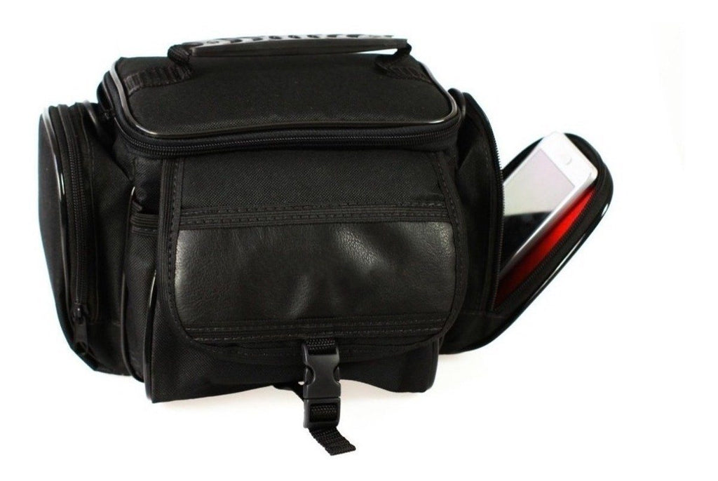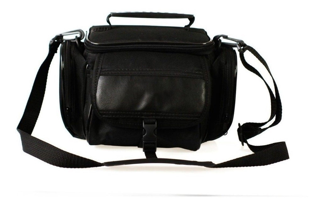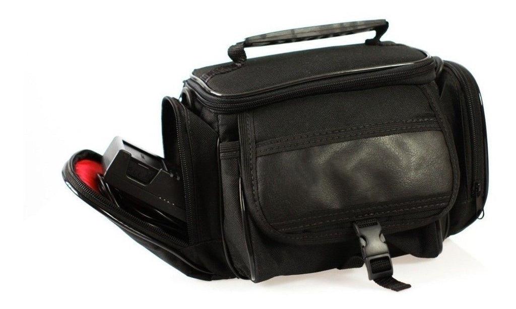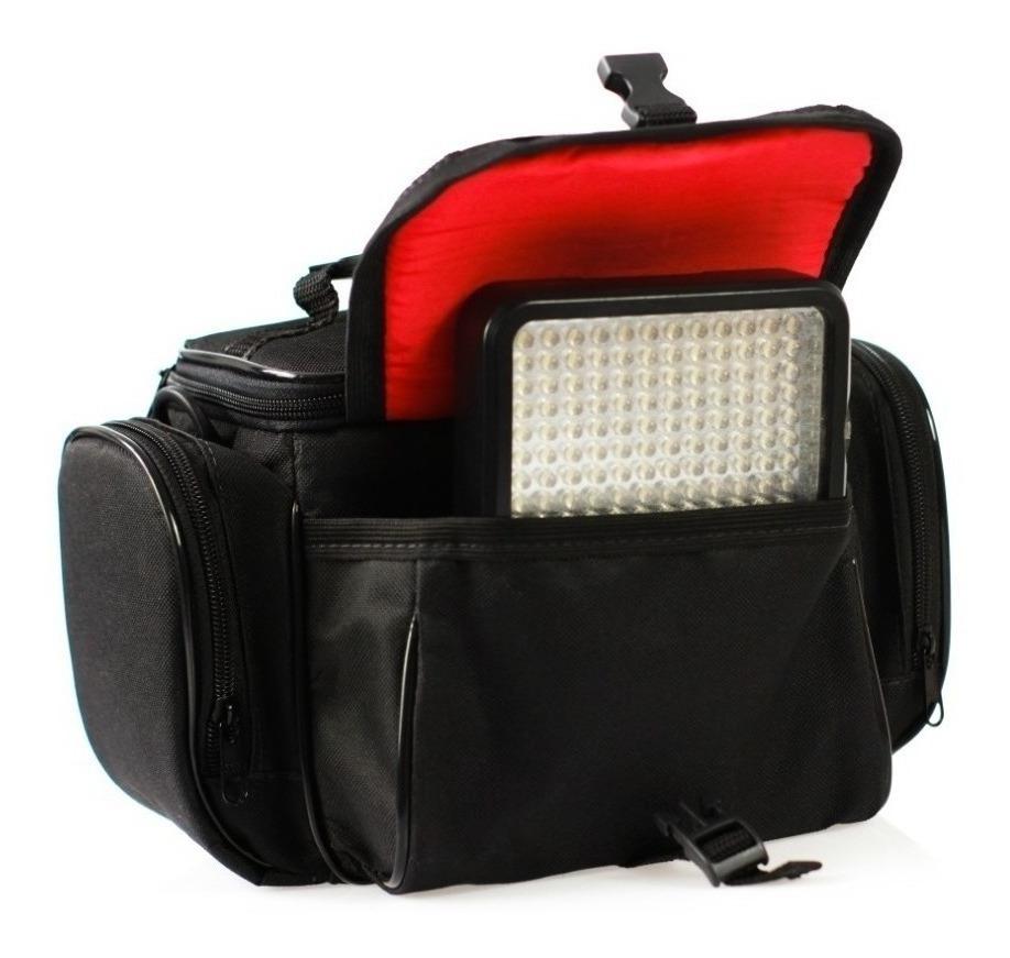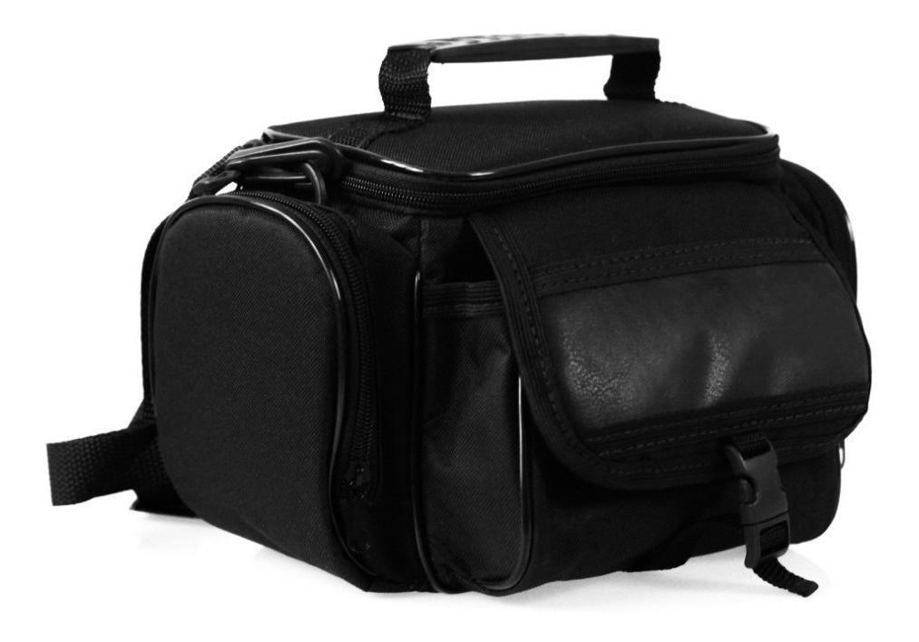- Bolso frontal e laterais para cabos, baterias e cartões de memória;